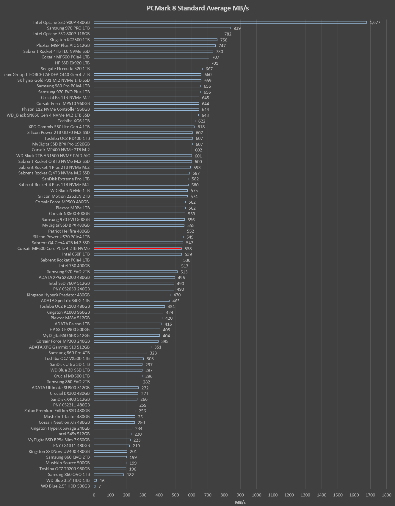 The Storage bandwidth of the Corsair MP600 Core PCIe 4 NVMe SSD is only 538MB/s which is what we might expect from a QLC SSD.