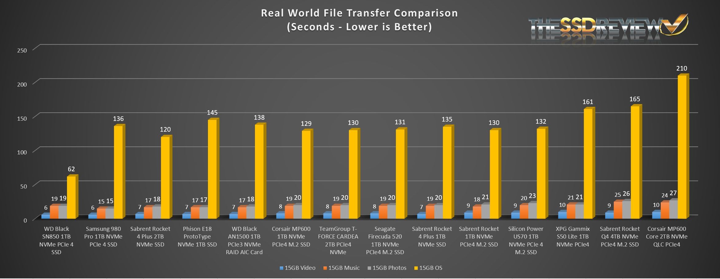 For our Real World File Transfer Comparison of the world’s top M.2 NVMe SSDs, we have included all Gen 4 SSDs tested to date to see exactly where they place beside the Corsair MP600 Core NVMe QLC SSD. This test is conducted through the transfer of data from one spot on the test drive to another to give us the truest of transfer speed results for that device.