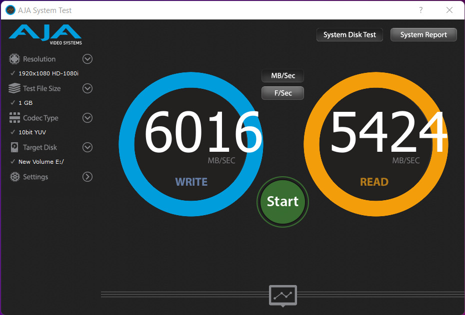 The AJA Video Systems Disk Test is relatively new to our testing and tests the transfer speed of video files with different resolutions and Codec.
