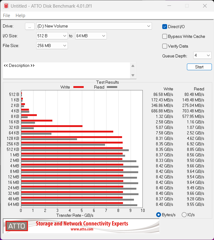 ATTO performance hits highs of 9.66GB/s read and 8.42GB/write which follow right along with listed specs.