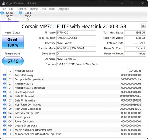 Crystal DiskInfo validates that our SSD is running in PCIe 5.0 x4, using the NVMe 2.0 protocol and confirms that it is TRIM capable.