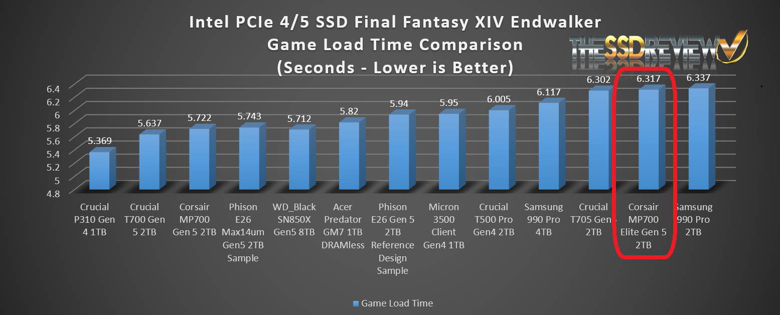 Game load time testing for the Corsair MP700 Elite came in at 6.3 seconds, placing at #12 of SSDs tested to date.