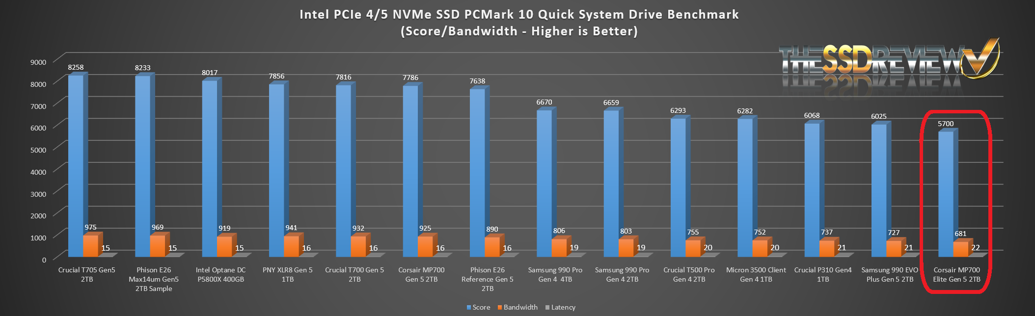The Corsair MP700 Elite Gen5 DRAMless 2TB SSD once again did great in placing with some of the best SSDs tested to date.