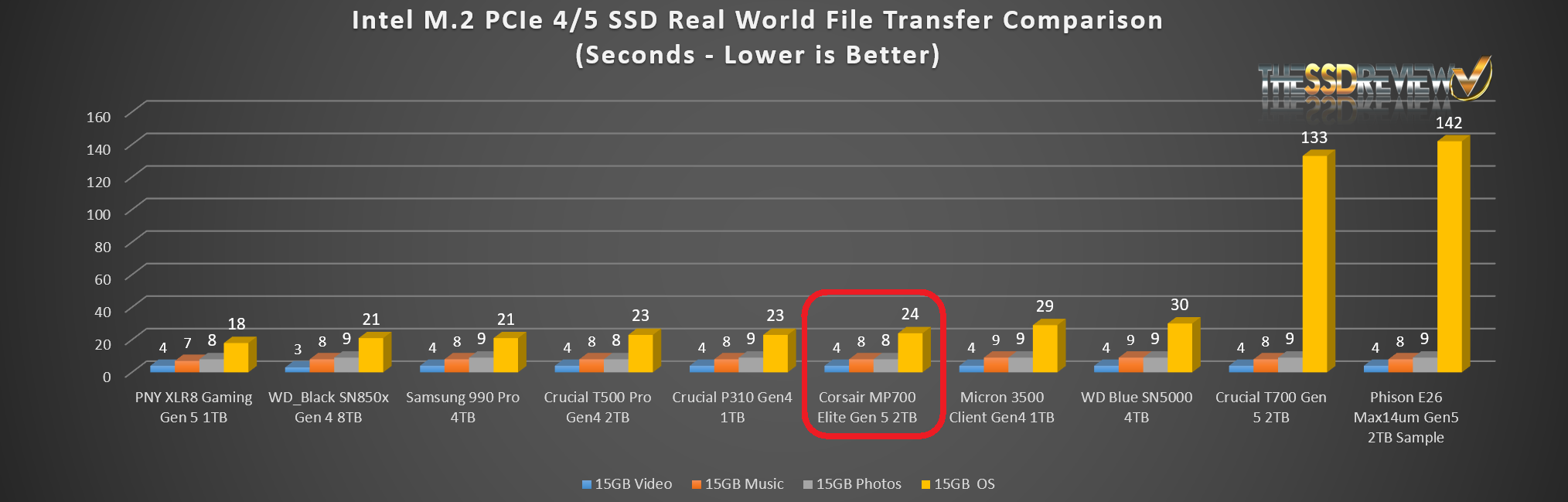Remember at the beginning of this report when we spoke of the importance of data transfer speeds relating to low 4K random read and writes? This tests is where the MP700 700 Elite shines best, placing 6th best of all tested and with a super low OS data transfer time of 24 seconds.