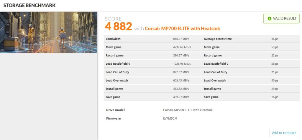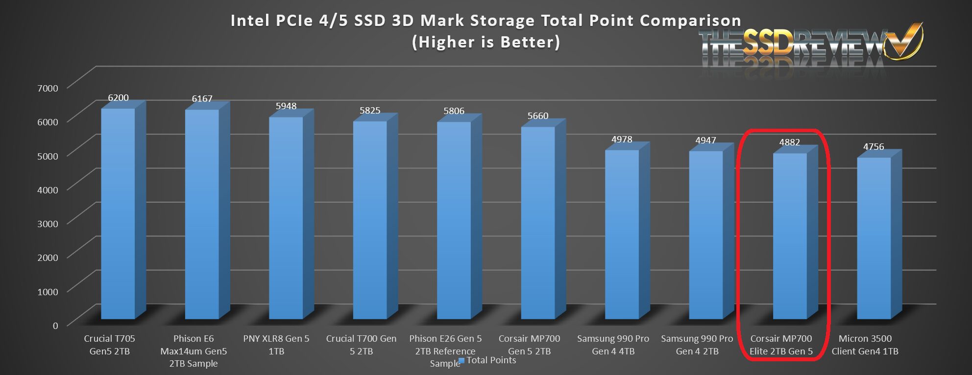 The Corsair MP700 Elite Gen 5 DRAMless NVMe SSD placed in the Top 10 SSDs tested to date for 3DMark Storage Benchmark.