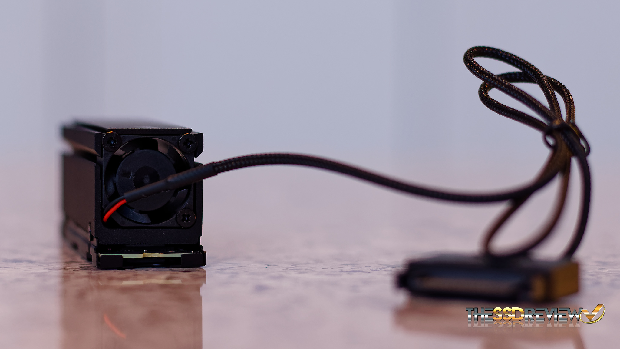 The version we are testing contains a black heatsink which has a fan within for active SSD cooling. There is a cable and SATA 15-pin power connector which must be attached to one of your PC SATA connector cables for the fan to work. The SSD does not achieve sufficient cooling without this connected and when attempting to utilize the heatsink without the fan.