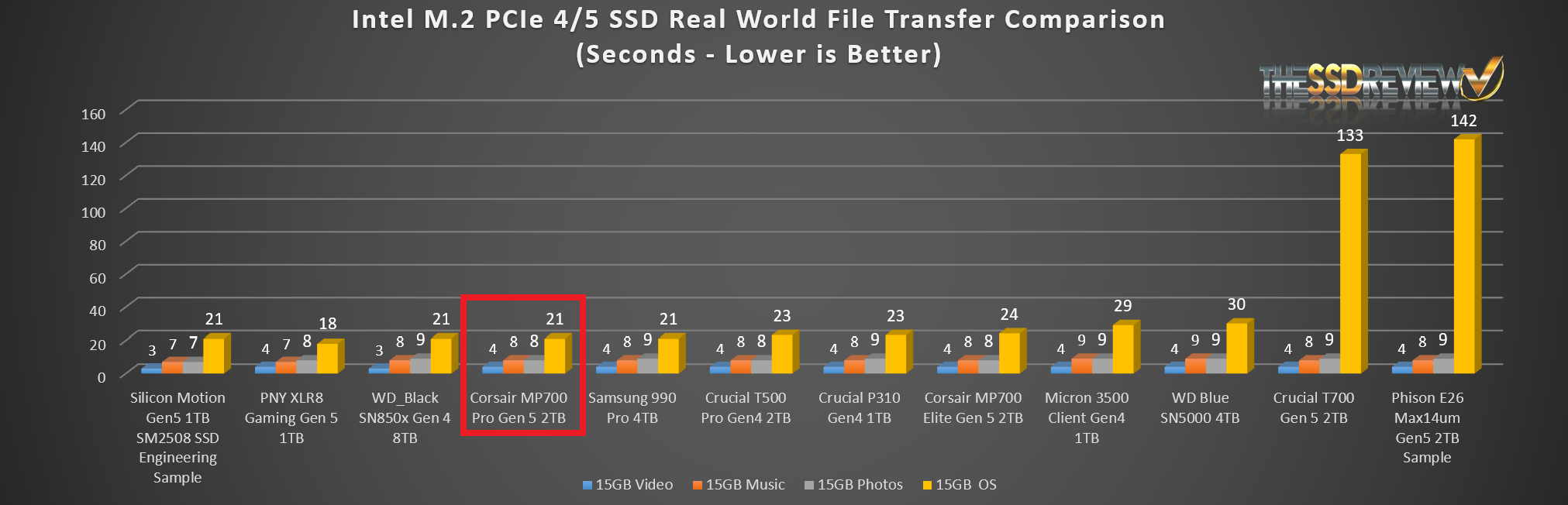 The Corsair MP700 Pro Gen5 2TB SSD Did very well in our Real Data Transfer testing and placed 4th of all SSDs tested to date.