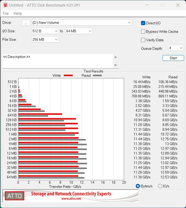 ATTO performance hits highs of 12.53GB/s read and 11.38GB/write which is just a bit below listed specs as is the norm for ATTO.