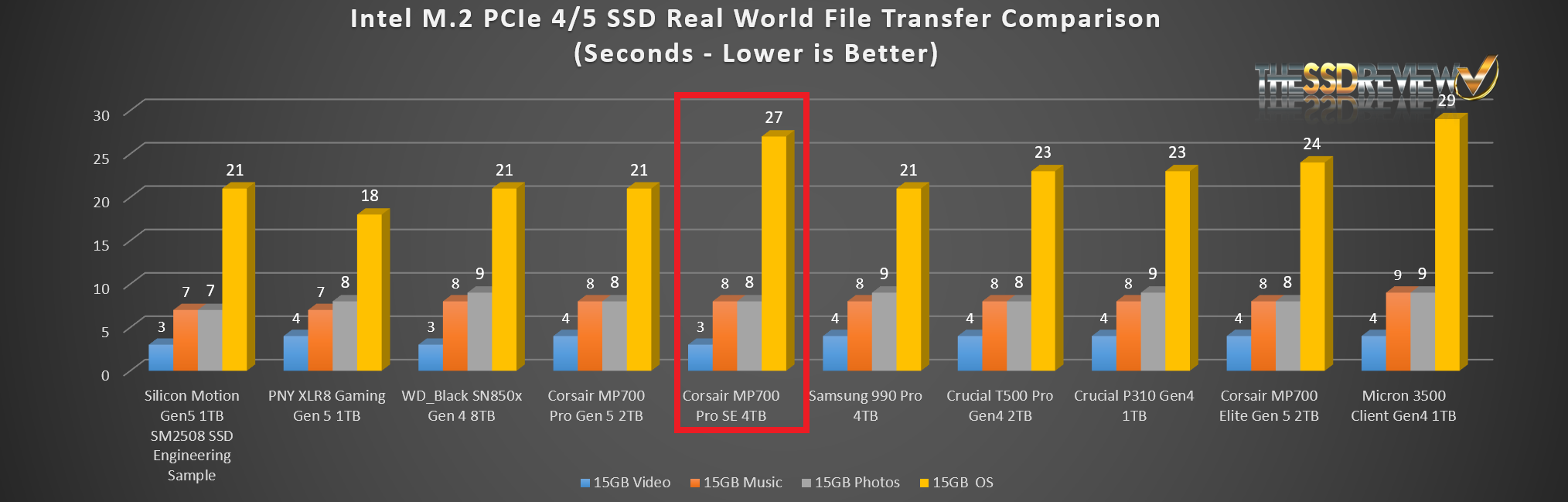 The Corsair MP700 Pro SE Gen5 4TB SSD did very well in our Real Data Transfer testing and placed 5th of all SSDs tested to date.