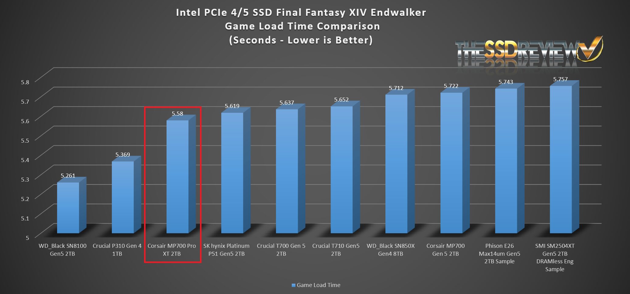Game load time testing for the Corsair MP700 Pro XT Gen5 SSD came in at 5.58 seconds, attaining the number three spot of all SSDs tested to date.