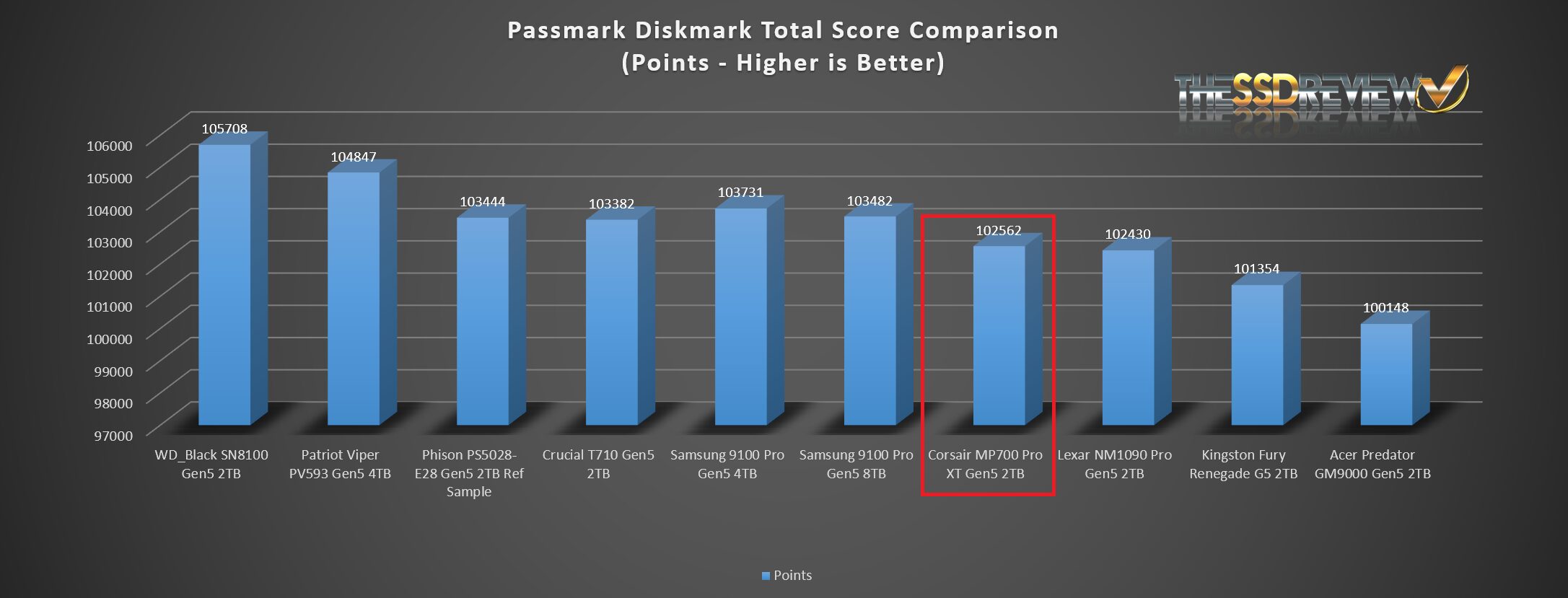 The Corsair MP700 Pro XT Gen5 SSD placed respectably at the No. 7 in the Top 10 results of the PassMark DiskMark Performance benchmark.