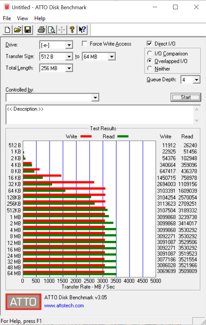 ATTO Disk Benchmark is perhaps one of the oldest benchmarks going and is definitely the main staple for manufacturer performance specifications. ATTO uses RAW or compressible data and, for our benchmarks, we use a set length of 256mb and test both the read and write performance of various transfer sizes ranging from 0.5 to 8192kb. Manufacturers prefer this method of testing as it deals with raw (compressible) data rather than random (includes incompressible data) which, although more realistic, results in lower performance results.