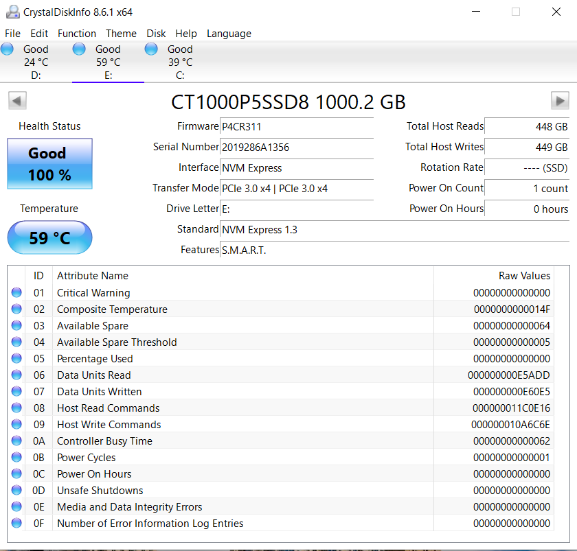 Crystal Disk Info is a great tool for displaying the characteristics and health of storage devices. It displays everything from temperatures, the number of hours the device has been powered, and even to the extent of informing you of the firmware of the device.