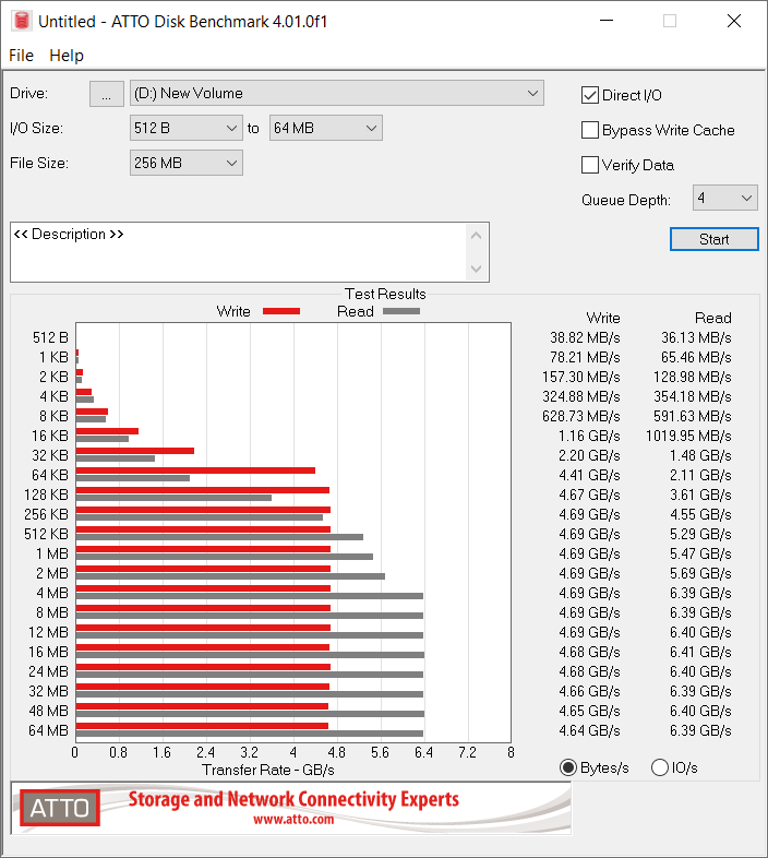 These are excellent ATTO results of 6.41GB/s read and 4.69GB/s write, just below listed specs with a strong performance progression as sample size increases.