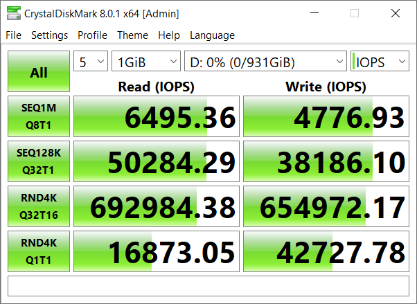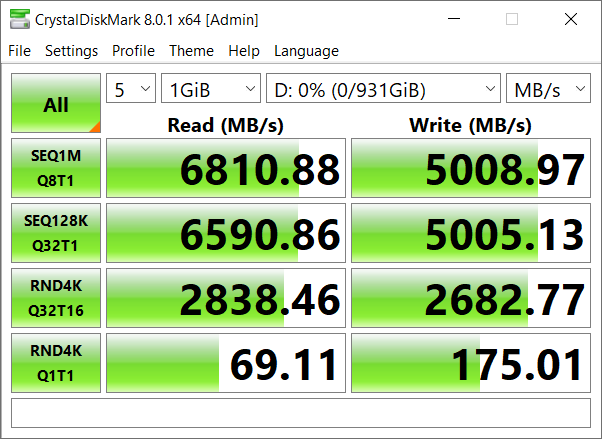 Crystal DiskMark results once again validate that listed specs of the Crucial P5 Plus. Low random 4K read and write are a bit under par as we are used to in AMD testing.