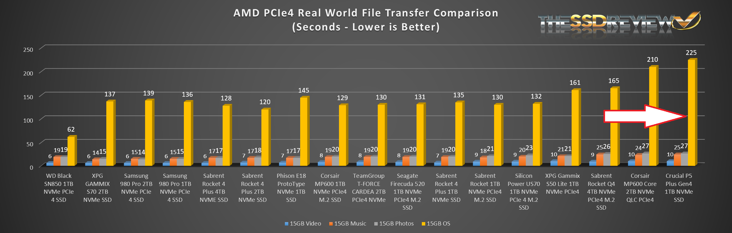 This result really confused us and each of these tests were conducted with our AMD Test Bench. We couldn’t believe there would be any way possible for Crucial’s best 176-layer TLC NAND flash memory to sit behind…QLC SSDs but that’s the result we came up with on three separate data transfer tests.