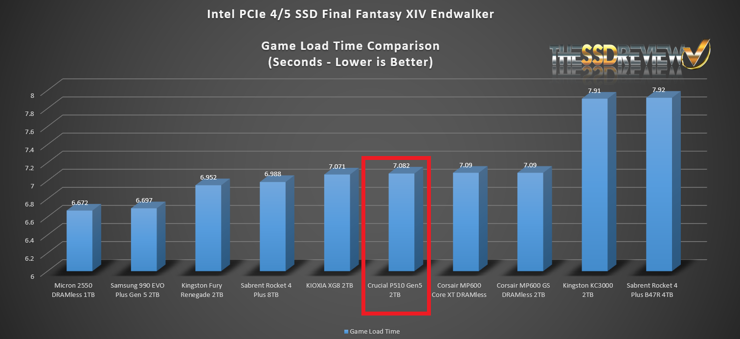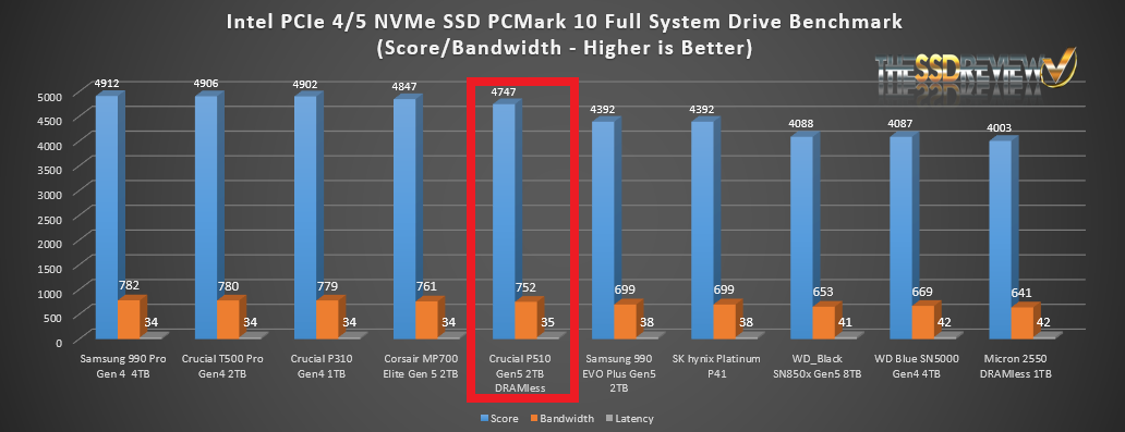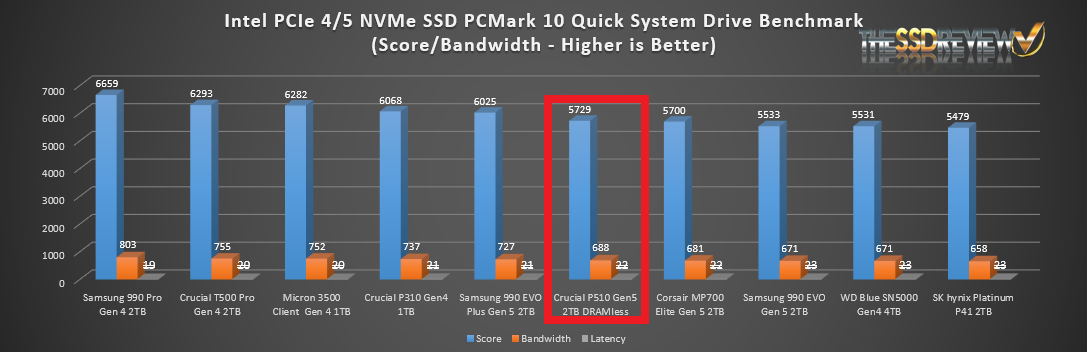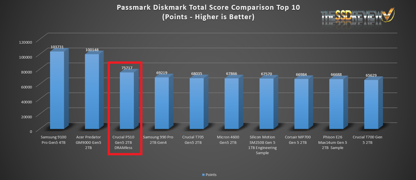 Once again, this chart DOES NOT depict the Top 10, but rather, where the Crucial P510 sits amongst similarly performing SSDs. We might suggest that placement amongst DRAM-based Gen5 SSDs is a good indication of the quality of this SSD.