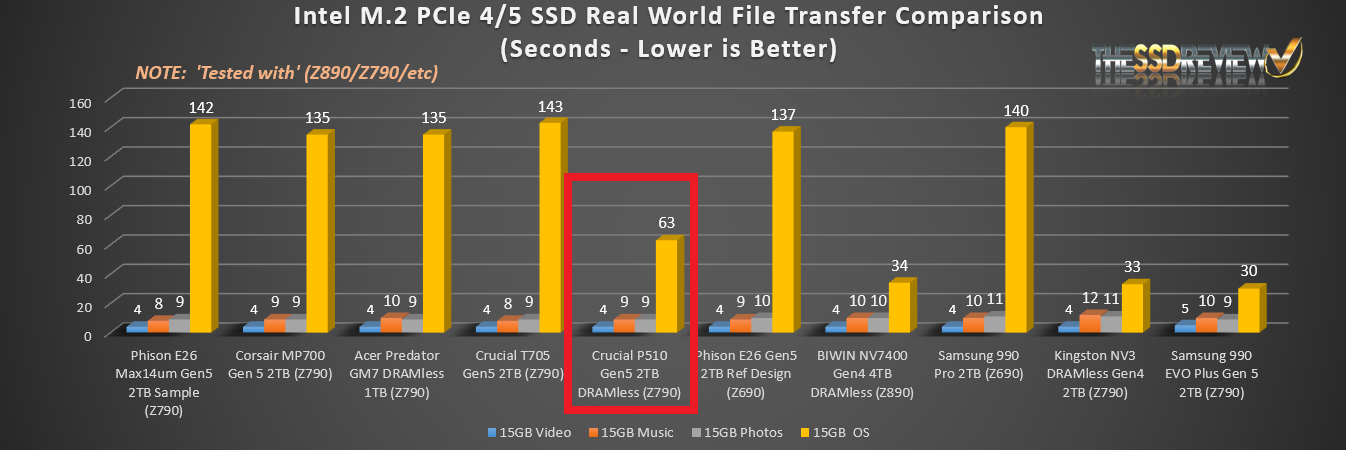 The Crucial P510 Gen5 2TB DRAMless SSD placed low compared to the number of SSDs tested to date in this scenario. We expected such from a DRAMless SSD.