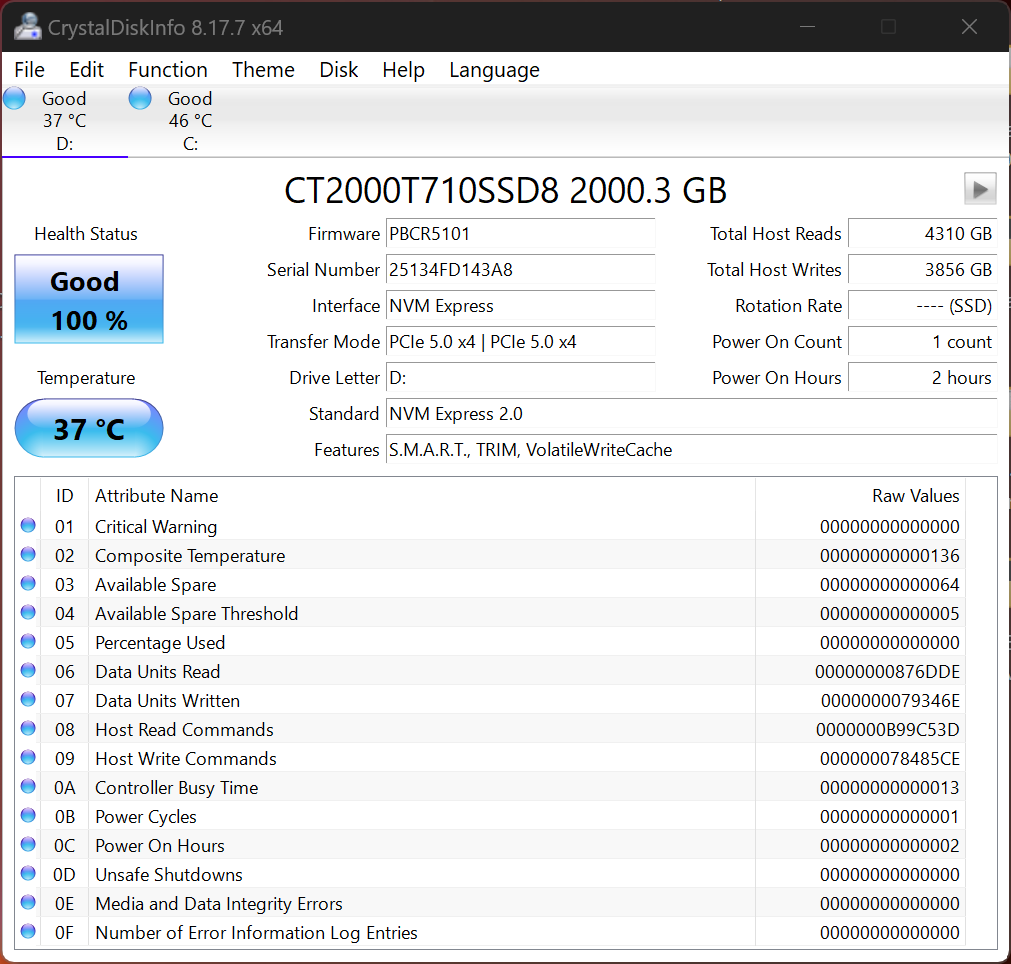 Crystal DiskInfo validates that our SSD is running in PCIe 5.0 x4, using the NVMe 2.0 protocol and confirms that it is TRIM capable.