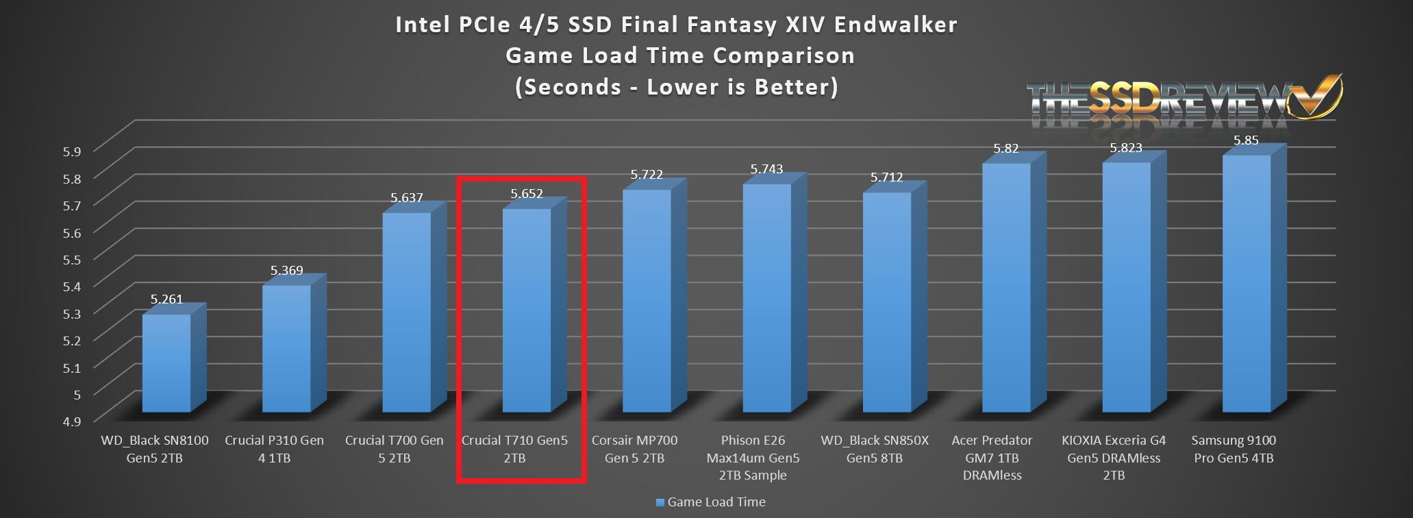 Game load time testing for the Crucial T710 came in at 5.6 seconds, fourth of all SSDs tested to date.