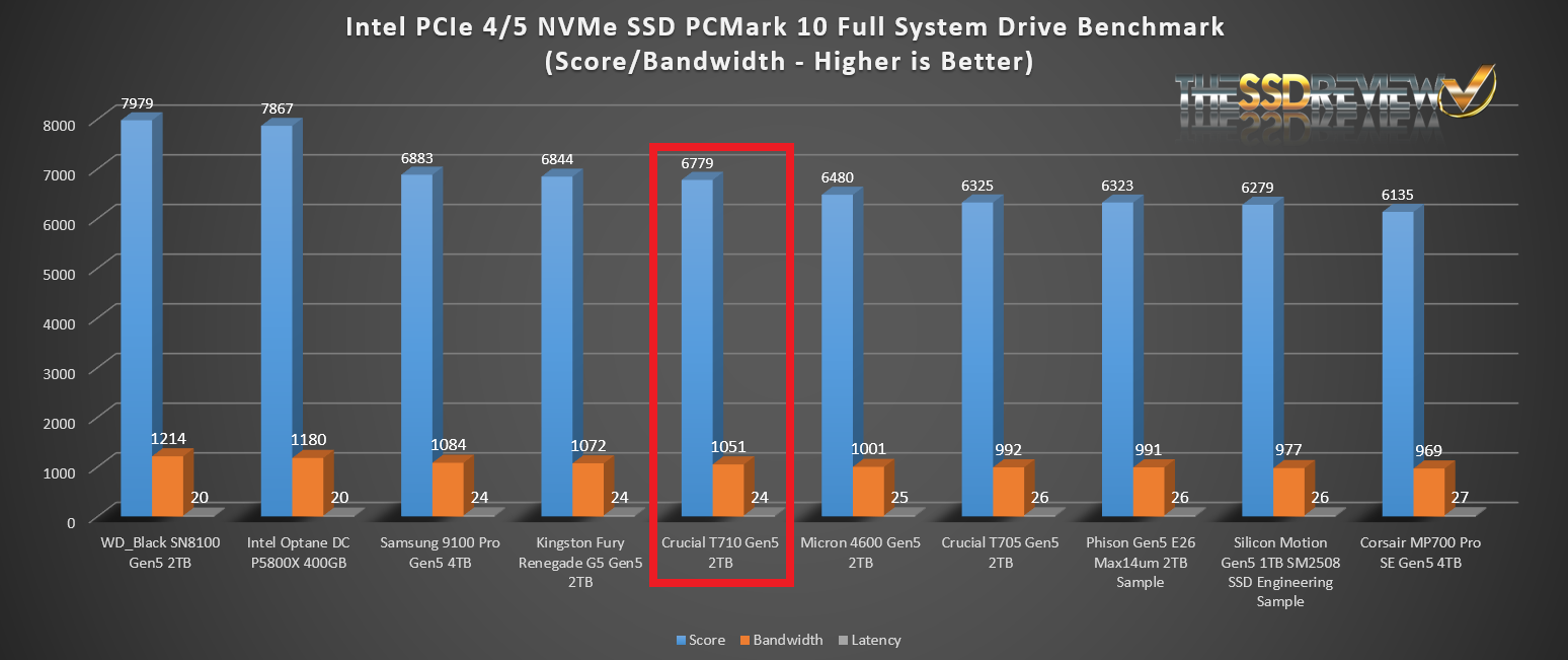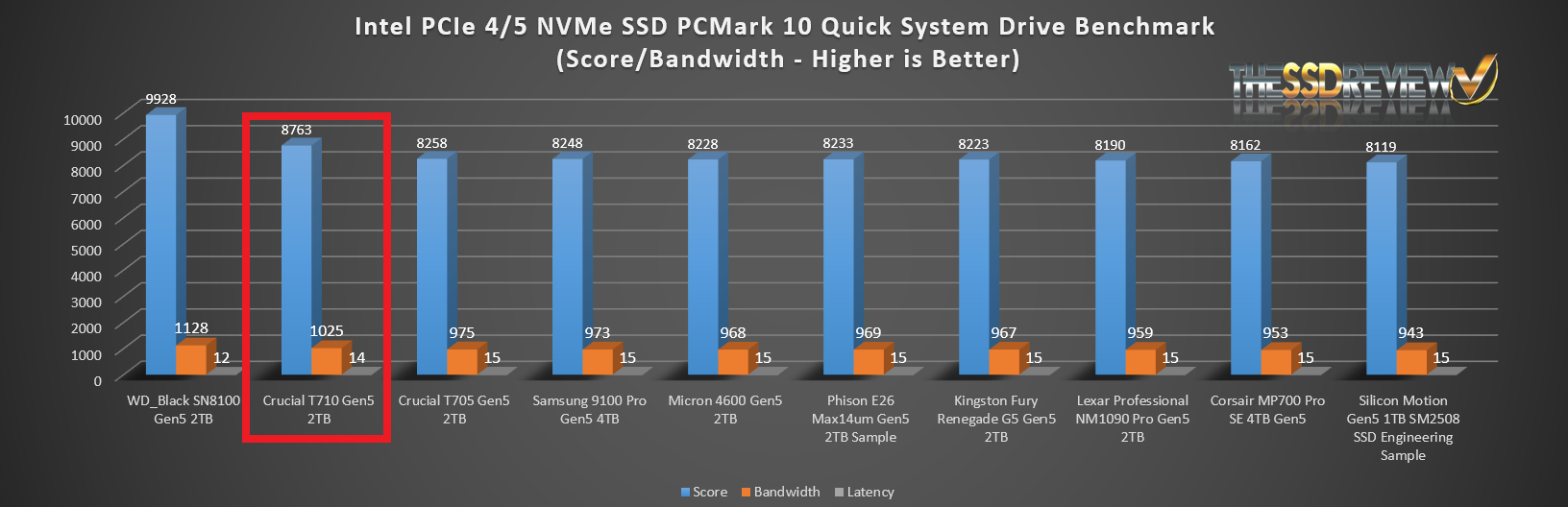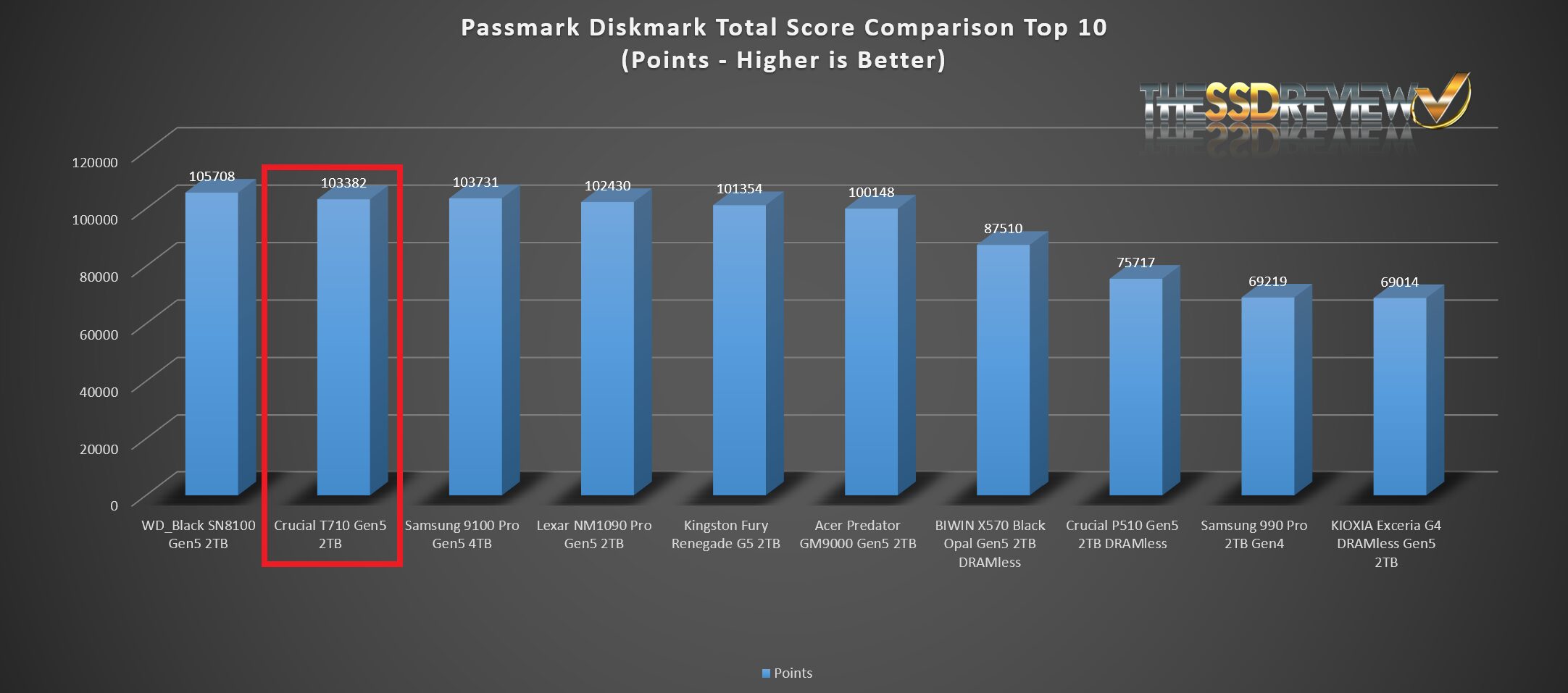 The Crucial T710 Gen5 2TB SSD placed fifth of all SSDs tested to date and, coincidentally, right in front of its Micron 4600 twin.