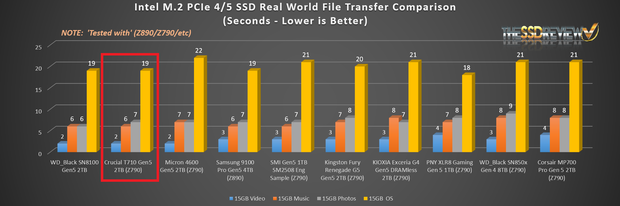 The Crucial T710 Gen5 SSD is the second fastest SSD tested in our real world data transfer testing to date, just behind the WD_Black SN8100 and, once again, right beside its twin Micron 4600.