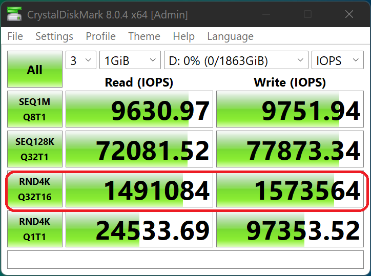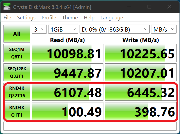 Now if you take a look at our earlier result of this same SSD in its original reference design posted above, but for different firmware we are certain, you might see a significant difference in random performance, even though we had originally tested in Q32T16. Compare that low random 4K Q1T1 read and write result alone if you like. This is the result of testing with an Intel Test Bench, compared to an AMD Bench. To be very clear, these two lower results ARE NOT the result of the T700. We would lay our reputation on the fact that you are going to see higher random 4K IOPS that will easily break the million mark (below) as with our testing, as well as some of the best low random 4K throughput results with reads breaking the 100MB/s mark and writes close to if not over 400MB/s (above).