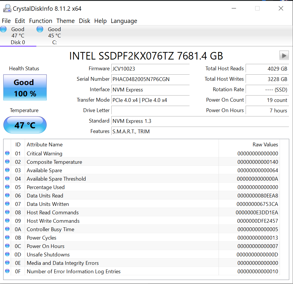 Crystal DiskInfo validates that we are running in Gen 4×4 mode and, as well, that we are running in the NVMe 1.3 protocol.