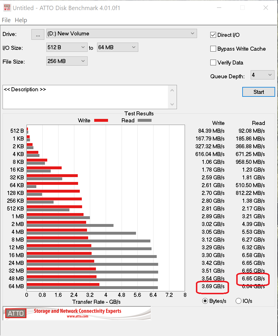 Performance highs in ATTO are 6.65GB/s read and 3.69GB/s write which is just a bit shy of listed specs.