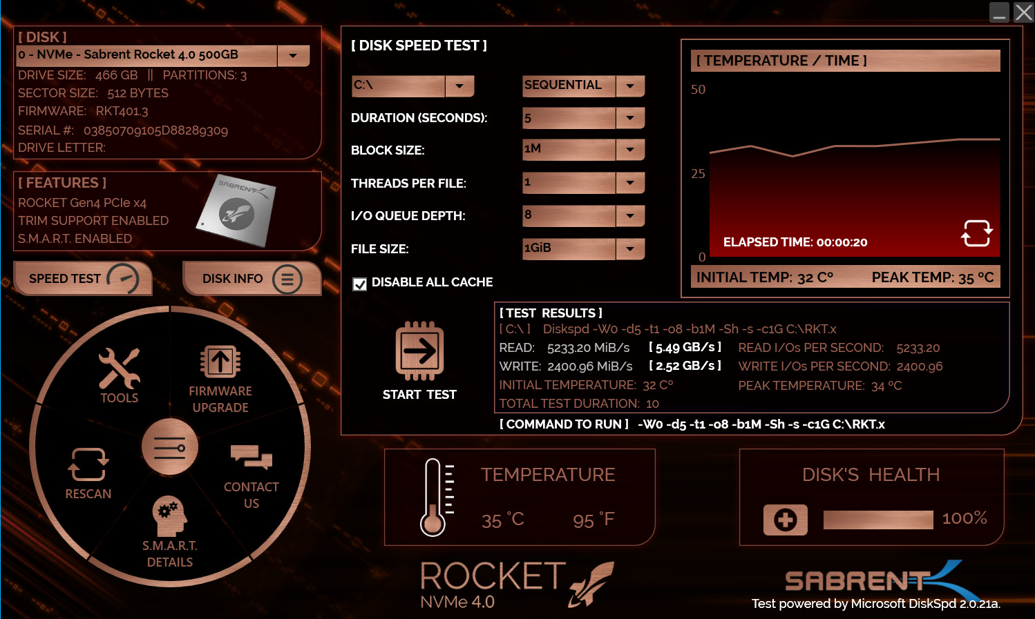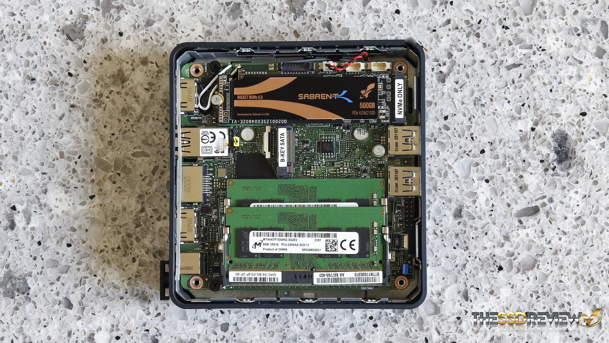 That Sabrent Rocket 4.0 NVMe SSD we see inside the Intel NUC 11 Pro has a black and gold metal heatsink branding that actually has direct contact via thermal tape to the aluminum baseplate of the NUC11 Pro for maximum heat dissipation. This ensures the Sabrent SSD stays cool in such a small device, even while hitting performance up to 5GB/s, or IOPS as high as 421,000. Better yet, you can monitor and maintain the performance of that Sabrent Rocket 4.0 NVMe SSD with Sabrent’s own FREE Rocket Control Panel shown here: