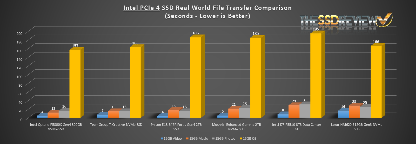 For our True Data Testing, we simply loaded 15GB video, music, photo and OS files onto the Intel Optane 400GB P5800x and copied the data to a new folder on that same disk. These Test results reflect Tests only completed on ouir newest Intel Z590 Test Bench.