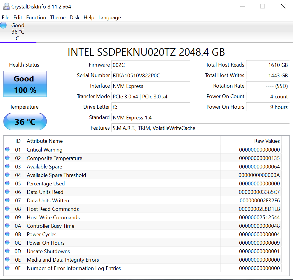 Crystal Disk Info validates that our SSD is running in PCIe 3.0 x4 (four lane), and also that NVMe 1.4 protocol is in use.