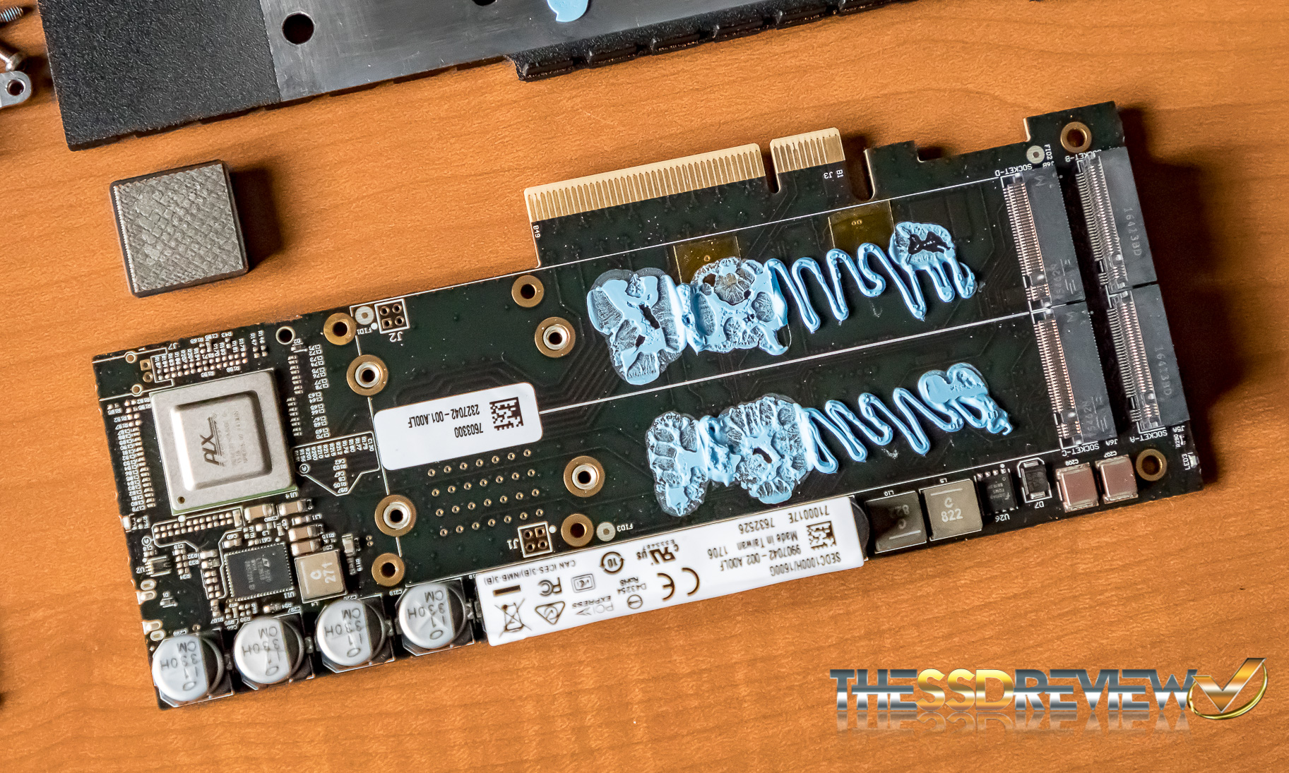 Looking at the board set up a bit more closely, we can see by the connector configuration that the SSDs sit side by side in and one atop the other. There is a heatsink for the PLX switch and there is also an abundance of heatsink compound between the first SSD and board.