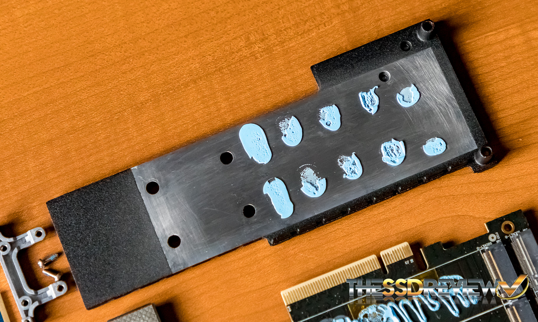 This carries on between the two SSDs where there is also a metal plate to assist between each SSD, and then more compound between the top SSD and top cover, also designed to dissipate the heat built up by the four SSDs pushing out such high throughput and IOPS.