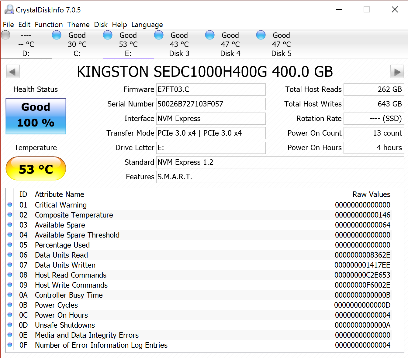 Crystal Disk Info is a great tool for displaying the characteristics and health of storage devices. It displays everything from temperatures, the number of hours the device has been powered, and even to the extent of informing you of the firmware of the device.
