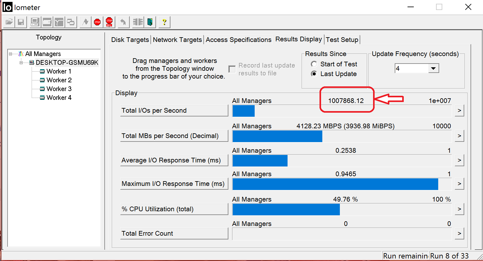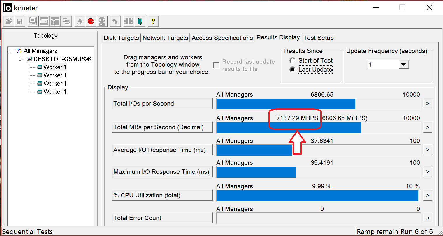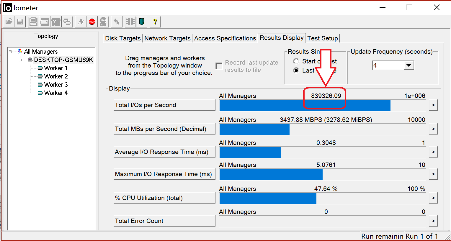 Last but not least, we simply wanted to try to achieve listed specifications for the Kingston DCP1000 NVMe SSD using IOMeter. These aren’t steady state results and nothing more than an effort to confirm that we could reach that 1mil IOP mark. The tests are in RAID 0, sample file size of 70GB, 4 workers at 128 outstanding IOs per. Our ‘4 Corners’ Test consists of 4k 100% random read and write, as well as 128K sequential read and write. Enjoy!