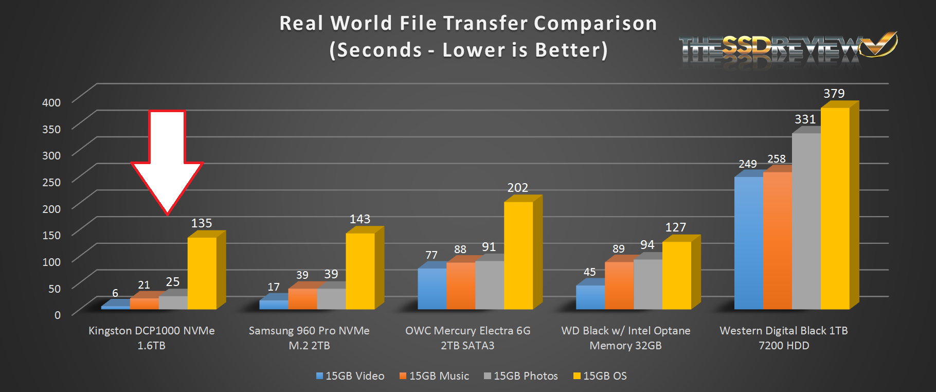 For our file transfer comparison consisted of the Kingston DC1000 1.6TB NVMe Data Center SSD, Samsung 960 Pro 2TB NVMe M.2 SSD, OWC Mercury Electra 2TB SATA 3 SSD, newest Intel Optane System with HDD, and a WD Black 7200RPM HDD. Our data samples consisted of 15GB folders of video, music, photos and operating system and all movement was simply copying from one folder to another on the drive.