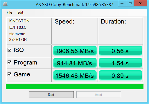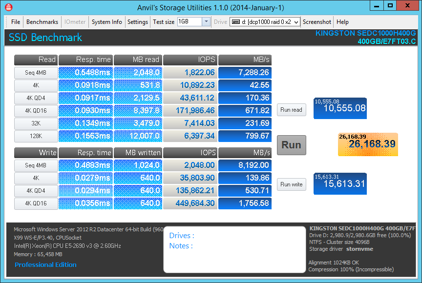 All in all, we weren’t really impressed with AS SSD results as the IOPS remained at a mil IOPS that we had seen previously, with throughput only jumping up 2GB/s, unlike that of what Crystal Diskmark displays. We see much the same with Anvil Disk Utility below…. pushing the limits of our software.