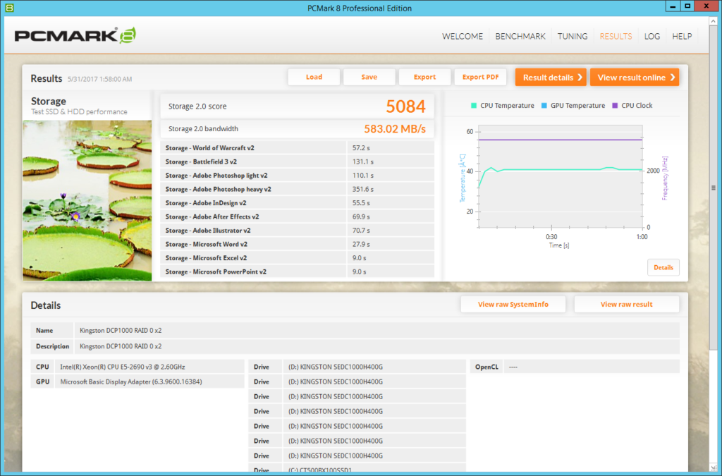 The same could be said when we tested in PCMark 8with a top score of 5084 and transfer speed of 583MB/s, much lower than one might expect from a 14GB/s RAID configuration.