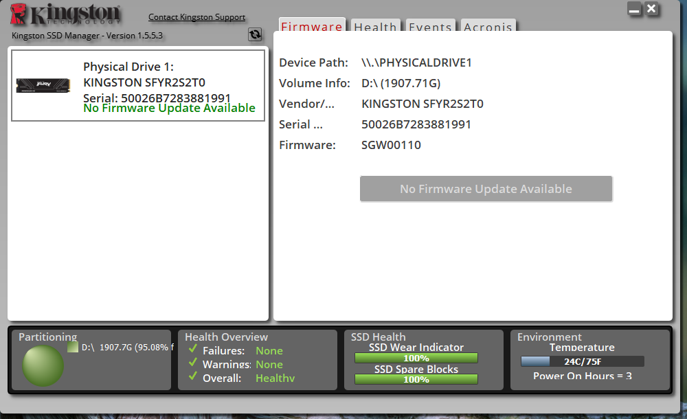 The KFR G5 comes with a 5-year limited warranty and free technical support, a free copy of Acronis True Image cloning software, and one can also download Kingston’s Storage Manager software shown in the above photo for free here.