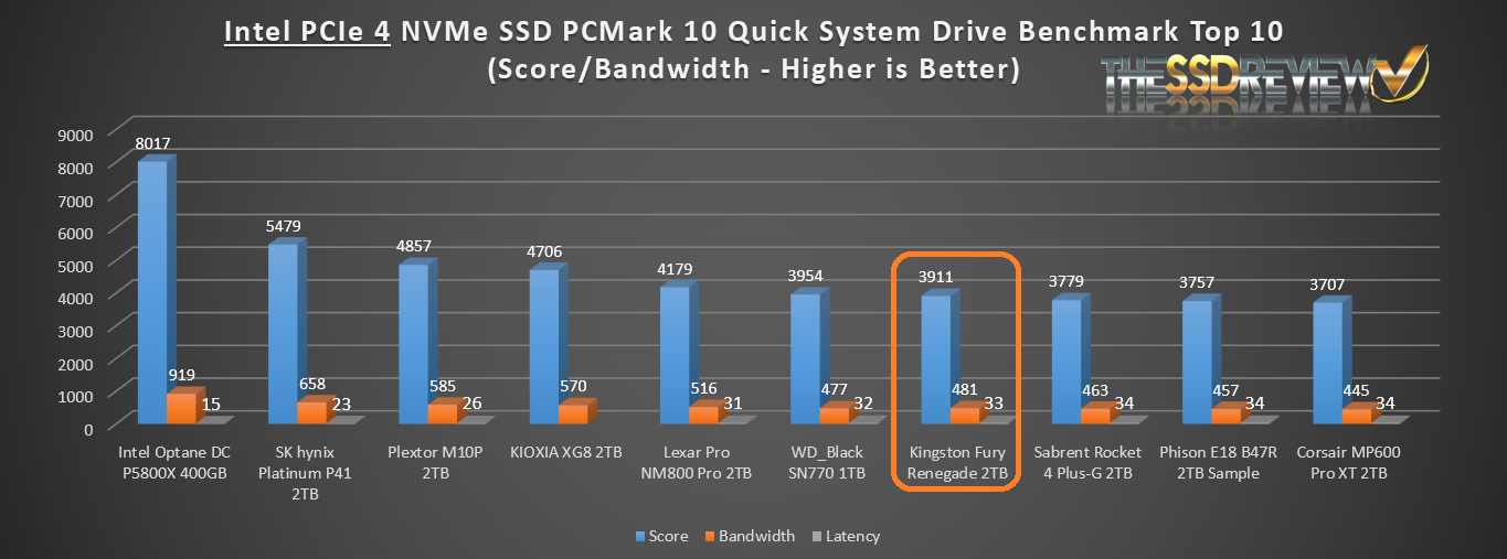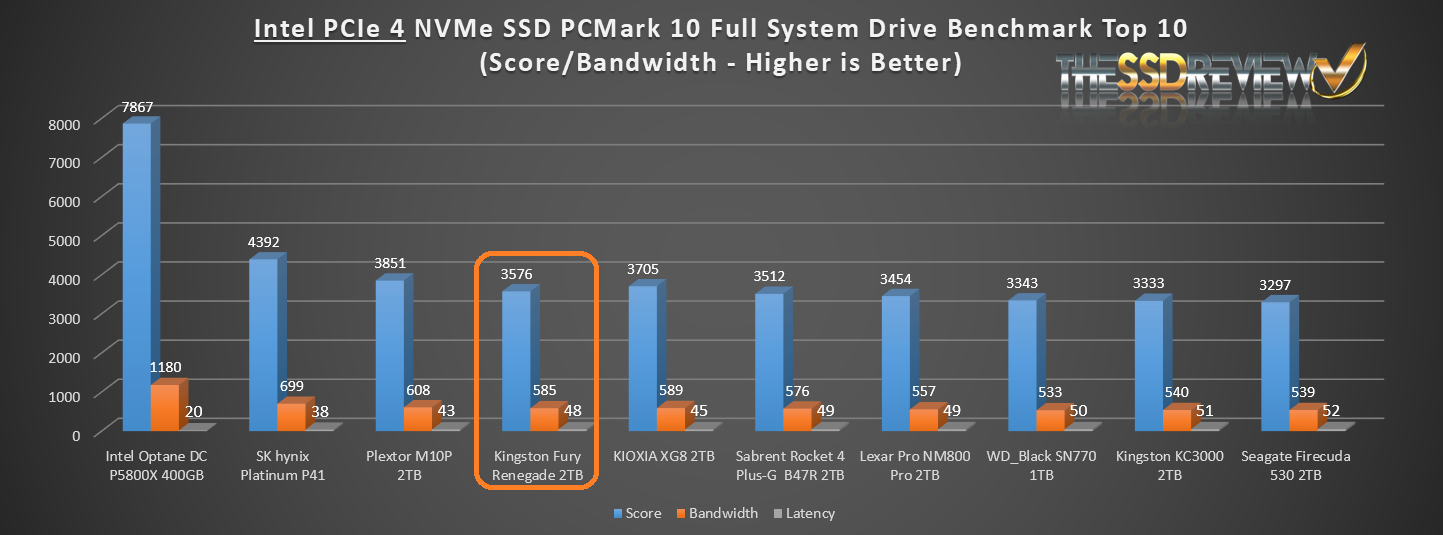PCMark 10 results placed the Kingston Fury Renegade Gen4 2TB NVMe SSD at number 4 of all SSDs tested to date which is a return.