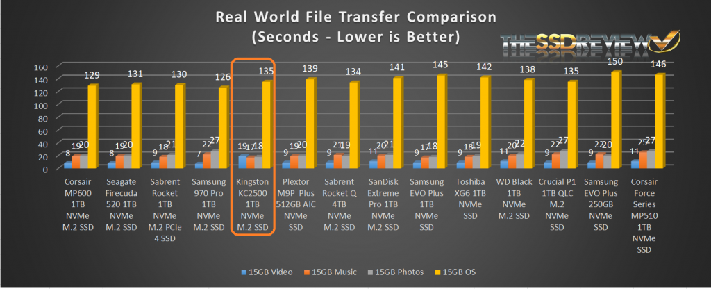We have put the Kingston KC2500 Plus NVMe SSD beside the best in the business for our true to life data testing. In this test, we simply place 15GB files representing music, video, pictures and operating systems onto the target drive. We then copy each file from one place on the target disk to another, recording the time taken for the transfer.