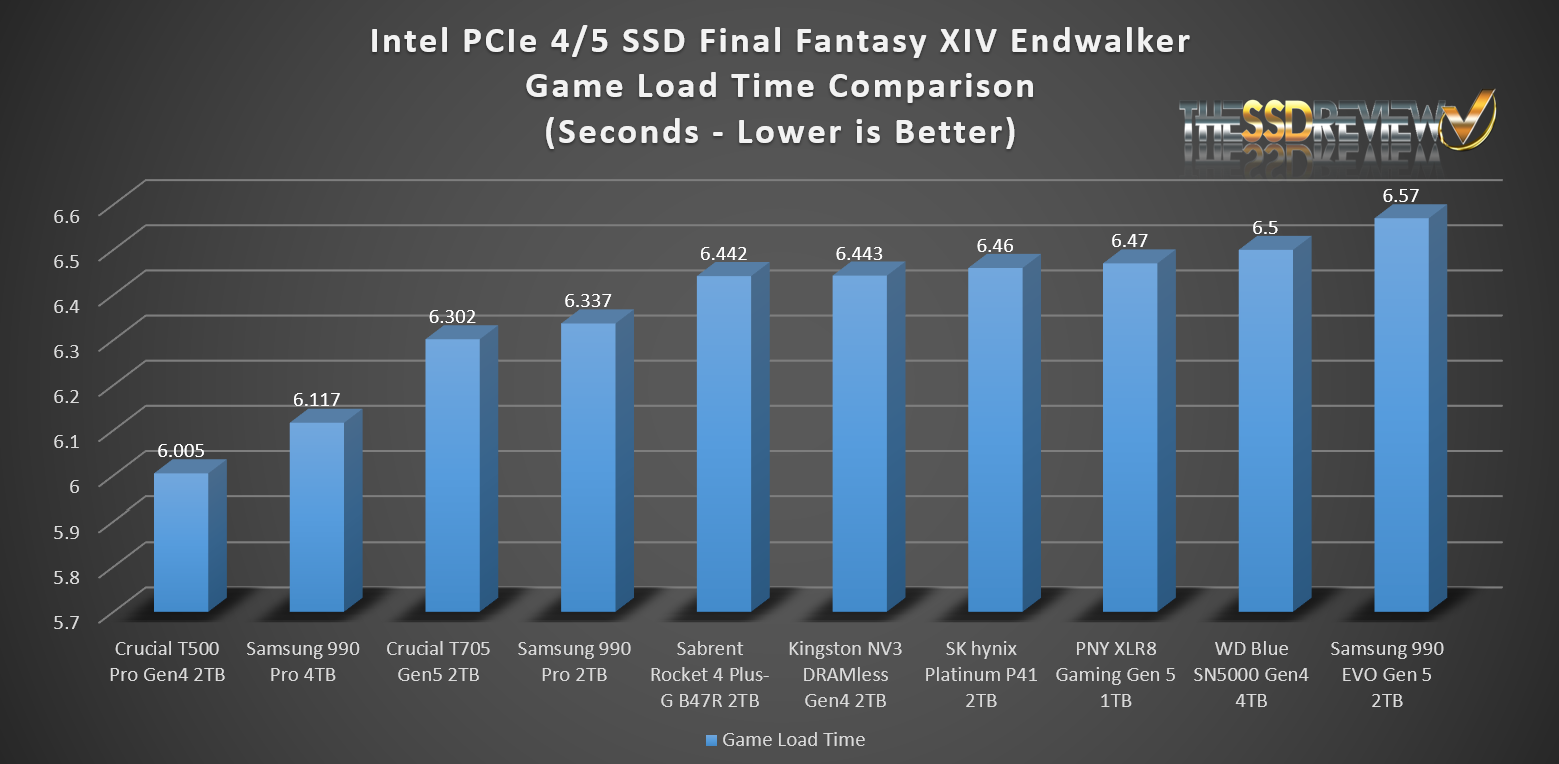 The Kingston NV3 Gen 4 SSD completed this test with a low game loading time of 6.443 seconds which is decent considering the company it keeps. Its placement over all SSDs is 14th, with less than 2 seconds difference between this SSD and the top SSD.
