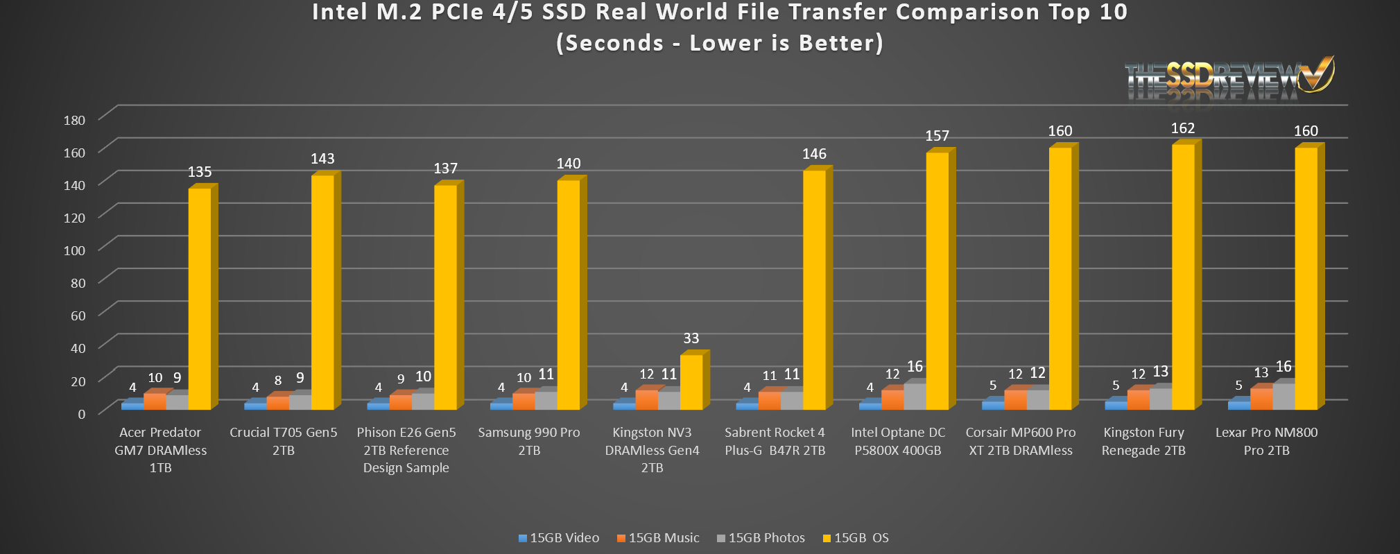 The Kingston NV3 2TB Gen 4 SSD placed 15th in all SSDs tested to date for our Real World Data testing. This chart again does not identify the top candidates, but rather, those comparable to the NV3. Particularly impressive with respective to this SSD is the speed in which it moves those small OS files.
