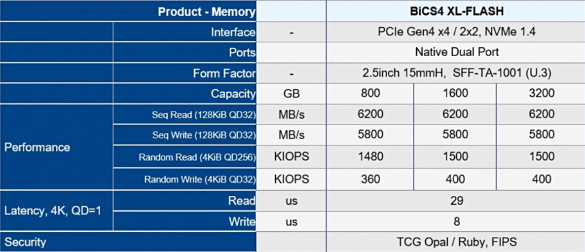 The KIOXIA FL6 contains a native dual port PCIe 4.0 interface and uses the latest NVMe 1.4 protocol. It will be available in capacities of 800GB to 3.2TB, speaks to a massive 60 DWPD (Drive Writes per Day) endurance, has SED and FIPOA 140-2 certification and is NVMe over Fabric ready.