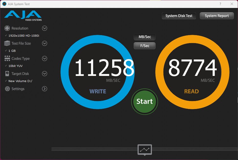 The AJA Video Systems Disk Test is relatively new to our testing and tests the transfer speed of video files with different resolutions and Codec.
