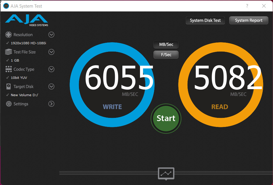 The AJA Video Systems Disk Test is relatively new to our testing and tests the transfer speed of video files with different resolutions and Codec.