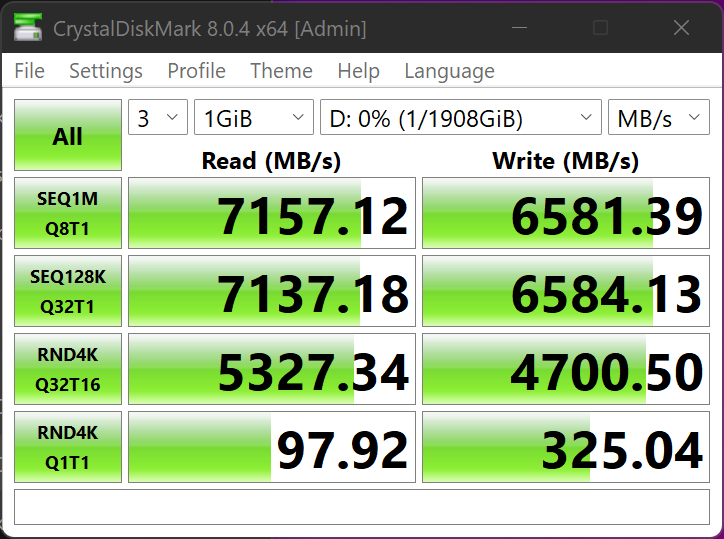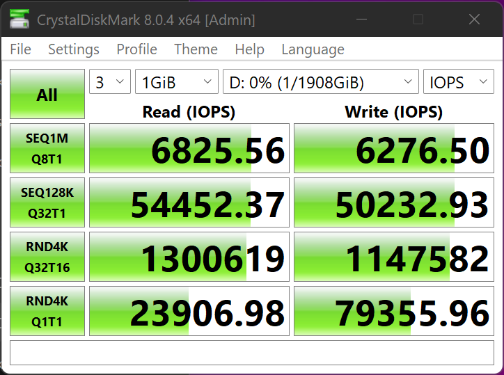 Throughput of 7.1GB/s read and 6.5GB/s write are decent, however, read and write random 4K IOPS above 1.1 million IOPS is very impressive.
