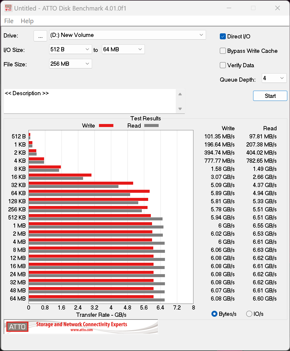 ATTO Disk Benchmark is one of the longest-standing benchmarking tools and remains a core standard for manufacturer performance specifications. It tests using raw, compressible data. For our benchmarks, we use a fixed 256MB test file and measure both read and write performance across transfer sizes ranging from 0.5KB to 8192KB. Manufacturers favor this approach because it uses compressible data, which produces higher performance results compared to random, incompressible data that more closely reflects real-world usage.