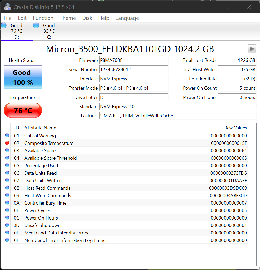 Crystal DiskInfo validates that our SSD is running in PCIe 4.0 x4, using the NVMe 2.0 protocol and confirms that it is TRIM capable. You may notice the temp differences with and without the heatsink above. These are extreme tests where we had to really push to reach these temps. We can confirm that the Micron 3500 Client, void of any heatsink, is still an ideal SSD for any laptop or ultra book